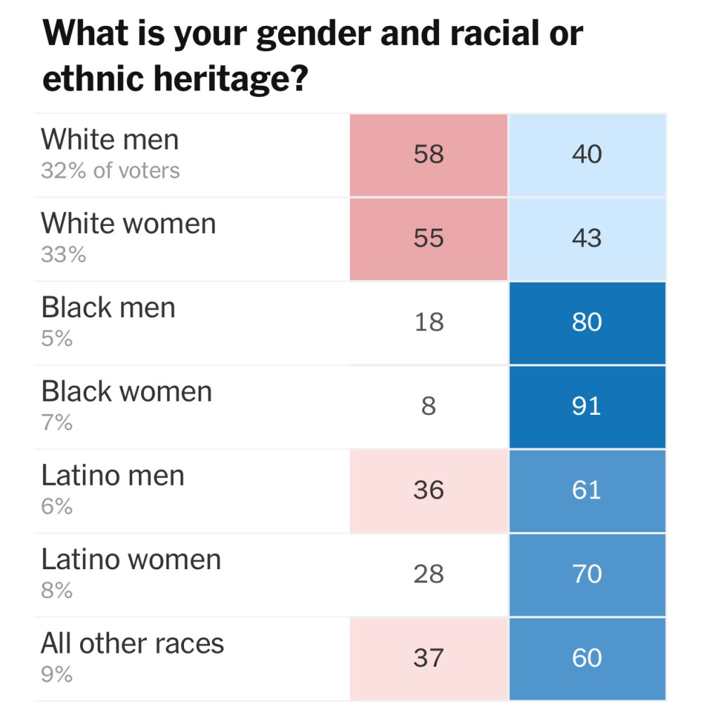 After four indisputable years of the horrible leadership of Trump, they sided with him and gave him most of their votes – 58% of white men and 55% of white women.