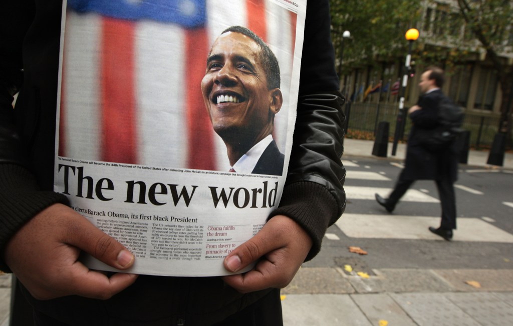 A vendor sells a copy of The Times newspaper featuring Barack Obama on the cover outside the US embassy on November 5, 2008 in London. Global news outlets were dominated with news of Barack Obama’s historic victory in the US presidential elections.