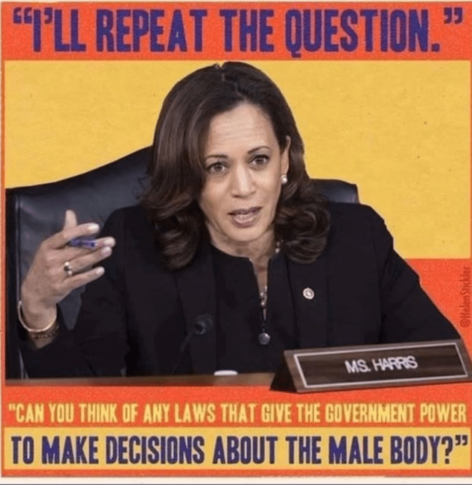 In fact, at Brett Kanvanaugh’s hearing then Senator Kamala Harris asked: “I’ll repeat the question. Can you think of any laws that give the government power to make decisions about the male body?”