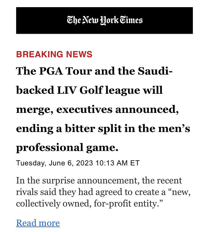 Billionaire Yasir Al-Rumayyan is now the king of golf. He is the chairman of the new golf organization following PGA and LIV’s agreement to merge. He is now golf’s most powerful man — and his ties with Saudi Crown Prince Mohammed bin Salman just means that the billionaire House of Saud, perpetrators of 9/11, murderers of journalist Jamal Khashoggi, and co-owners with Elon Musk of the cesspool that is Twitter, have far too much money and influence in America because.. capitalism does what capitalism does.