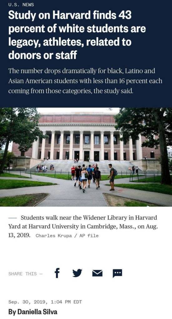 We don’t control Ivy League schools or admittance rules. As with everything in this nation the system/process is run by white men and a small percentage of white women. But every single time some privileged family’s little genius doesn’t get that coveted spot they blame that one Black student who got in. They don’t blame the legacy white kids who take up most of the slots, or the wealthy donor kid who paid their way in, or the foreign non-Black kid who excelled and got in.