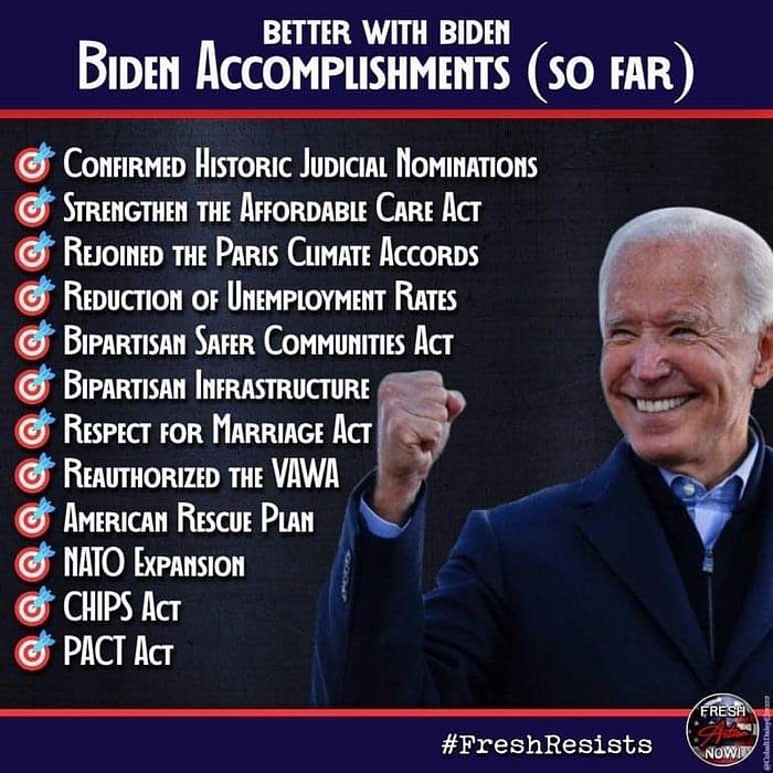 They successfully calibrated the federal government and put it back on track to work toward advancing democracy, preserving federal lands and Native lands, rebuilding infrastructure, modernizing rural technology, eliminating student debt, and restarted climate work.